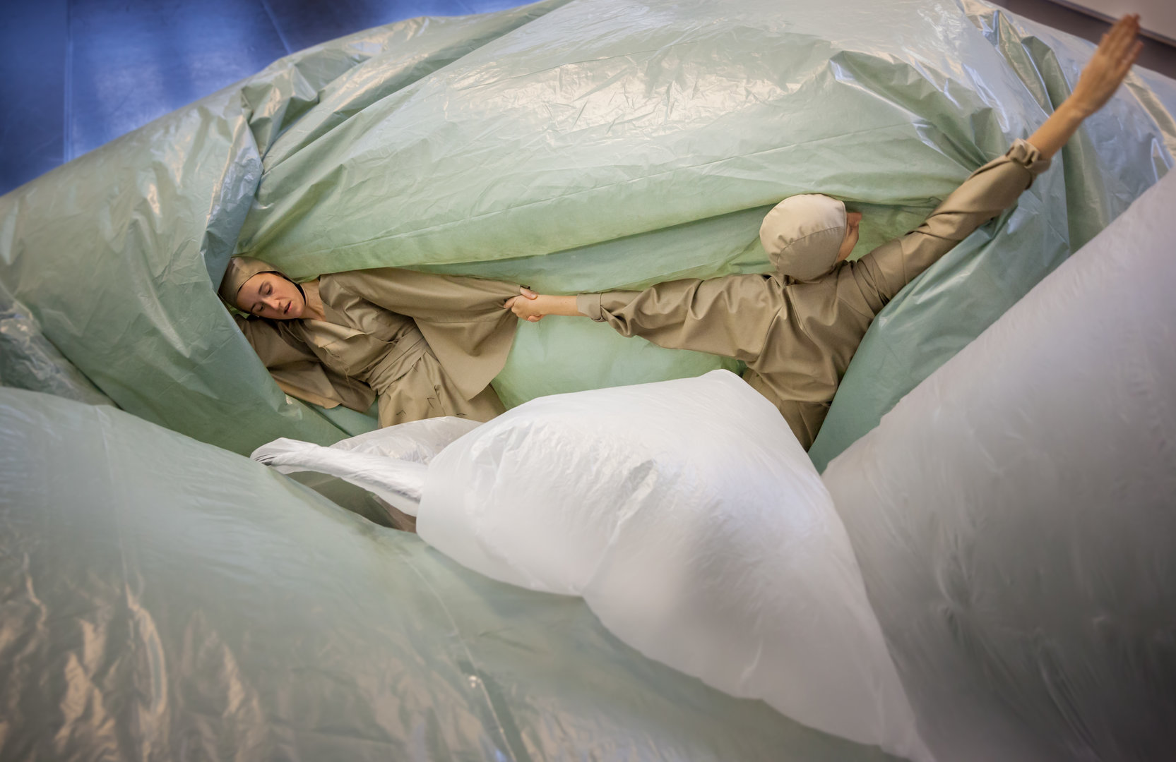 In einer sich langsam aufblasenden Bühnenlandschaft des Stage-Designers Dan Lancea, die mal die Gestalt einer Schnecke, eines Ungeheuers oder eines schlaffen Phallus annimmt, führen die Performerinnen Madalina Dan und Manon Parent einen skurrilen Feldzug gegen die ganz ordinären Dämonen des Alltags. Während Kartoffelchips-getriebener Welt- und Selbstverbesserungs-Phantasien, Smartphone-induzierter Contactless Impro oder einem lethargischen Gähn-Wettbewerb bricht plötzlich die Wut aus den Tänzerinnen heraus, nur um sich im nächsten Moment zerstreuen zu lassen, und gleich darauf schon wieder dem Aktionismus zu verfallen. Jeden Umweg nehmend, kämpfen sie sich zwischen Faulheit und Apathie hin und her, ertrinken kläglich in der Langeweile und triumphieren lautstark über die Prokrastination. Auf diese Weise entfaltet sich im Laufe von Question of Belief eine von Dan und Parent verkörperte Dämonologie des Zeitgenössischen. Zu den subtilen Synthesizer-Rhythmen der Sound-Designerin Jean P'ark, die durch ihre formale Struktur mal an altgriechische Epen, mal an frühe Videogames erinnern, bezeugen die Zu- schauer:innen eine verkorkste Odyssee durch unsere mehr oder minder produktiven Besessenheitszustände der Gegenwart. Question of Belief untersucht die vielfältigen Körperkonstitutionen, in die wir im Namen unterschiedlicher Glaubenssysteme versetzt werden, und schafft gleichzeitig einen Erfahrungsraum für die Wunder, die auch jenseits von spiritueller Askese und Work Hard-Paradigma immer schon möglich waren.