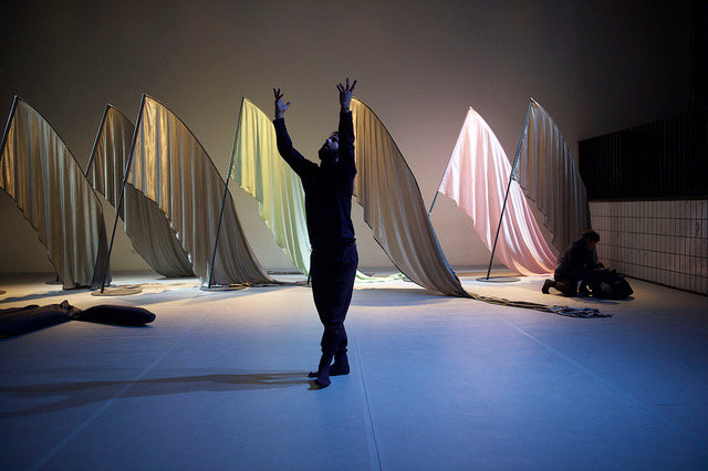 Wie manifestiert sich Pathos im Körper? Wie lassen sich pathetische Körperbilder produzieren, wie lassen sie sich unterlaufen und mit neuen Bildern und Bewegungen überlagern? Mit ihrer neuen Produktion HYPERBODIES untersuchen bücking&kröger Phänomene des Pathos, der Schwülstigkeit und der Übertreibung. In den letzten Jahren zu beobachtende Rede- und Auftrittsweisen zeigen, dass die große Geste wieder da ist oder nie weg war. Pathos scheint heute (wieder) eine politische Wirkungsmacht zu haben. Im Zentrum der Arbeit der ChoreografInnen Florian Bücking und Raisa Kröger steht dabei der Körper als Träger kultureller und historischer Motive, sowie als Spiegel aktueller Probleme. Pathosformeln des Manierismus und manieristische Bilder von bewegten Körpern, gekennzeichnet durch groteske Ornamentik und verzerrte Körperproportionen, werden in Korrelation gesetzt zu den umge- bauten, gebogenen, überladenen Körper auf der Bühne: Hyperkörper. Diese werden transformiert, schwellen an, kippen aus ihrer Form und zerfließen in überdimensionale schwülstige Gebilde, die ihre kraftvolle anziehende Wirkung offenbaren und zugleich darin entlarvt werden. Pathetische Bilder schwanken zwischen Feierlichkeit und Komik und werden so in ihrer Struktur aufgebrochen und unterwandert. Konzept, Choreografie, Performance Florian Bücking, Raisa Kröger. Produktionsdramaturgie Johanna Withelm. Raum, Grafik Fabian Reimann. Sound Julius Born. Kostüm Michiel Keuper. Lichtdesign Martin Pilz. Foto Mayra Wallraff.