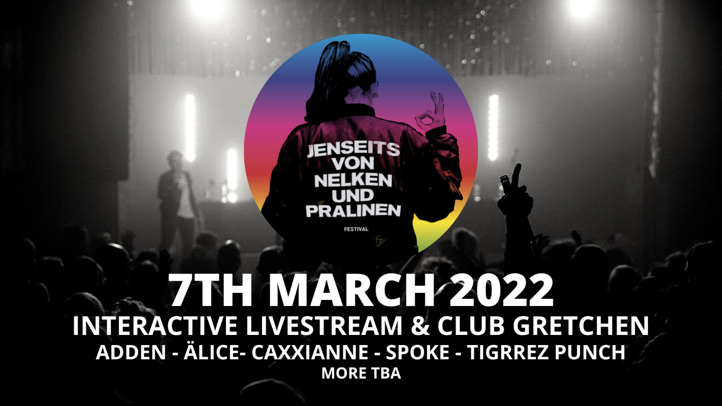 Wie immer gehört beim JENSEITS VON NELKEN UND PRALINEN Festival den Frauen* die Bühne und wie immer ist das Line-up krass. Dieses Mal stehen (inter)nationale Künstlerinnen aus dem deutschsprachigen Raum im Fokus der musikalischen Kampfansage. Mit einem Angebot von Oldschool über Trap bis Dancehall ist so ziemlich alles dabei, um maximal angemessen in den 8. März reinzufeiern! Willkommen im Club! Willkommen zu Hause! Nach dem großen Erfolg des interaktiven Streams 2021 habt ihr erneut die Möglichkeit, auch per Videokonferenz live beim Festival dabei zu sein. Über Leinwände holen wir euch direkt ins Gretchen, wo ihr 2022 endlich auch wieder gemeinsam mit “analogen” Gästen und natürlich den Acts auf der Bühne Teil des Festivals sein könnt.