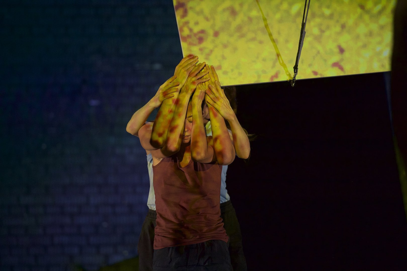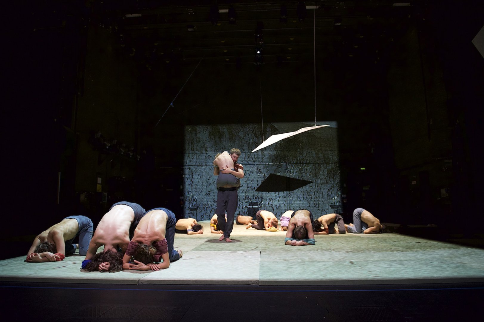 The "Shift of Focus" stellt die Schwerpunktverlagerung ins Zentrum des Geschehens und nimmt eine Verschiebung von Perspektive metaphorisch in den Blick. In einer mobilen Landschaft aus weichem Untergrund und fliegenden Wänden verhandeln 15 Performer*innen ihre Figurationen zwischen Protagonist*in und Chor, archetypischen und natürlichen Kräften, Bühnenmechanik und Marionette. Die Aktionen der Perfor¬mer*innen oszillieren dabei zwischen fliegen und fliegen lassen, ziehen und gezogen werden, tragen und sich tragen lassen, und ihre Rollen scheinen endlos umkehrbar. Leichtigkeit wird hier zur Antwort auf die Schwerkraft (und das Leben). Allmählich entfaltet sich ein Sog aus hybriden Verbindungen, in dem Körperlichkeiten und Material, Poesie und Humor, Stimme und Geräusch, gegenseitige Fürsorge und der wilde Flow einer Gruppe in Bewegung miteinander verwoben sind.