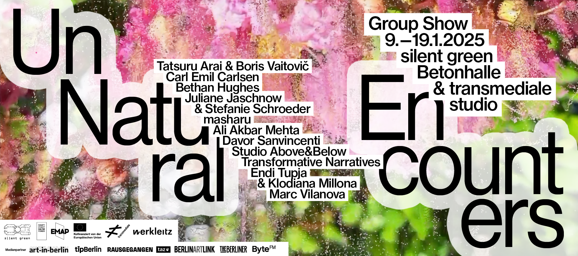 Was können künstlerische Perspektiven sichtbar machen, was uns reine Daten und Fakten nicht vermitteln können? Wie gelingt es der Kunst, diese erfahrbar zu machen? Können Kunst und Technologie gemeinsam neue Formen der Kommunikation, Empathie, Verbundenheit und Verantwortung für unsere Umwelt entwickeln Diesen Fragen widmete sich silent green im Januar 2025 mit der Gruppenausstellung UnNatural Encounters. In der Betonhalle wurden zehn ausgewählte Arbeiten präsentiert, die zwischen 2022 & 2024 im Rahmen der europaweiten Residenzprogramme der European Media Art Platform (EMAP) entstanden sind. Als Teil der Ausstellung zeigt transmediale eine elfte Arbeit im angeschlossenen transmediale studio. Die ausgestellten Werke beschäftigen sich mit elementaren Themen unserer Zeit: ökologische Nachhaltigkeit, sozioökologische Gerechtigkeit und den technologischen Wandel. Alle Künstler*innen arbeiten transdisziplinär und kollaborativ und verbinden Kunst, Wissenschaft und Technologie auf eine innovative Weise. In ihren akustischen Experimenten, immersiven Landschaften und spekulativen Zukunftsvisionen erforschen sie die komplexen Beziehungsgeflechte zwischen Mensch, Technologie und Umwelt. Ihre Ansätze sind vielfältig: Sie reichen von Datenvisualisierung und experimentellem Dokumentarfilm, über Klangskulptur und Performance, bis hin zu Video- und interaktiven VR-Installationen. Mit künstlerischen Arbeiten von Tatsuru Arai & Boris Vaitovič, Carl Emil Carlsen, Bethan Hughes, Juliane Jaschnow & Stefanie Schroeder, masharu, Ali Akbar Mehta, Davor Sanvincenti, Studio Above&Below, Transformative Narratives, Endi Tupja & Klodiana Millona und Marc Vilanova. Ein begleitendes Rahmenprogramm lud das Publikum dazu ein, die Themen der künstlerischen Arbeiten zu vertiefen und mit den Künstler*innen in den Austausch zu treten.