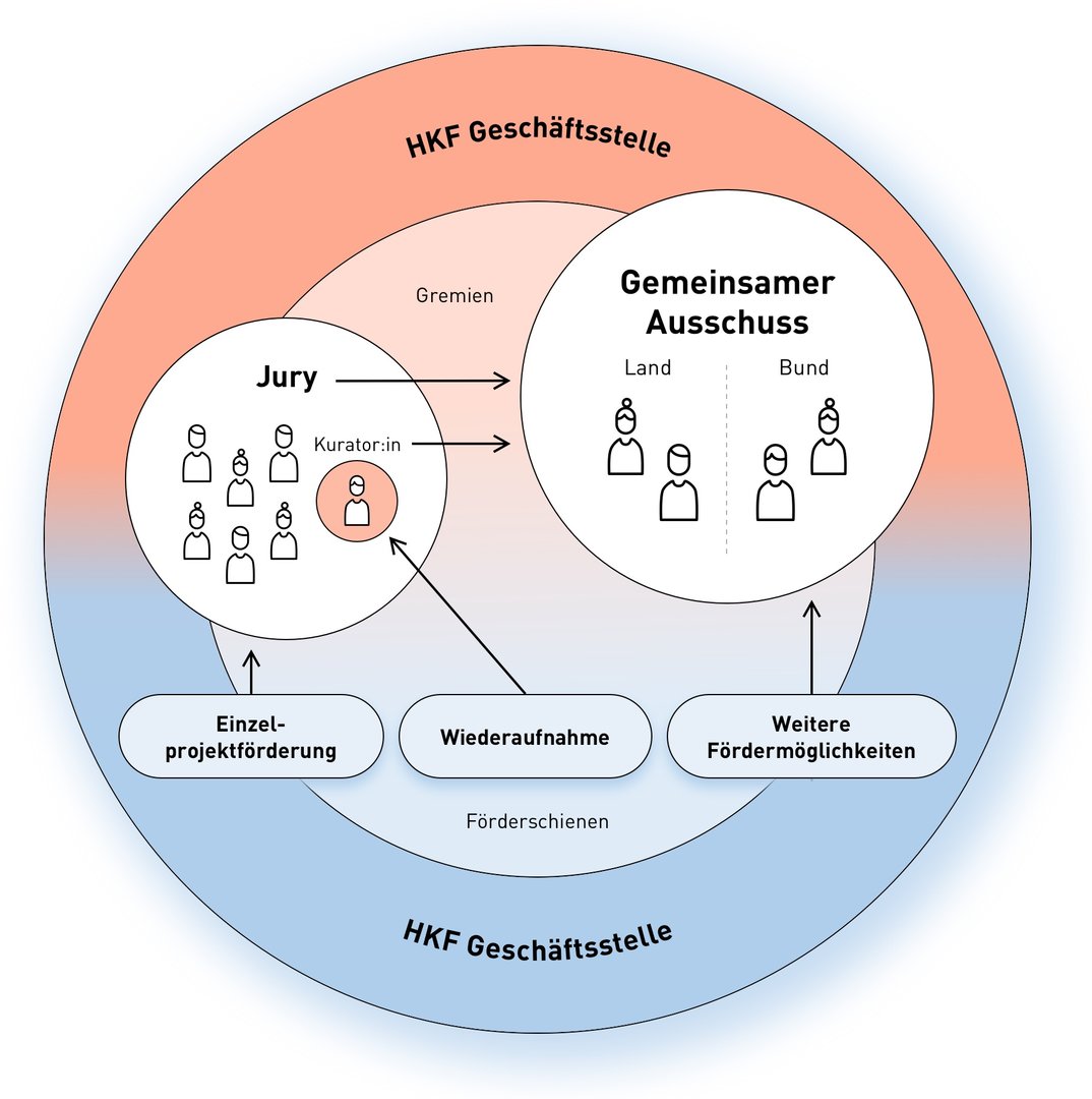 Die Beratung der Anträge wird von der Jury vorgenommen, der bis zu sechs Mitglieder angehören können. Der:die Kurator:in leitet die Sitzungen der Jury mit Stimmrecht, unterbreitet dem Gemeinsamen Ausschuss die Empfehlungen der Jury und trägt ggf. eigene vor. Zusammen mit der Geschäftsstelle bereitet der:die Kurator:in die Entscheidungen des Gemeinsamen Ausschusses vor. Über die Vergabe der Mittel entscheidet der Gemeinsame Ausschuss, dem jeweils zwei Vertreter:innen des Bundes und des Landes Berlin angehören.